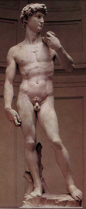 Вернувшись в 1501 г. во Флоренцию, Микеланджело получил от правительства республики заказ на создание огромной статуи Давида (1501-04). Статуя четырёхметровой высоты стала одним из самых прославленных произведений мастера и символом Флоренции. Скульптор использовал глыбу мрамора, испорченную неумелой рукой другого мастера. Давид представлен перед поединком: он стоит, отставив левую ногу, придерживая на плече пращу. Перед нами – не хрупкий юноша, каким обычно изображали Давида, а мужественный атлет с мощной мускулатурой. Молчаливое презрение, сдерживаемая перед поединком внутренняя сила переданы постановкой фигуры и суровым гневным взглядом, обращённым в сторону врага. «Давид» стал олицетворением безграничной мощи ренессансного человека, свободного и прекрасного.