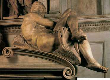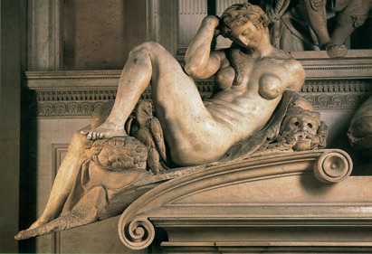 Работа над капеллой Медичи (1520-34), родовой усыпальницей властителей Флоренции, совпала с тяжелейшими испытаниями в жизни Микеланджело. В 1527 г. испанскими войсками был захвачен Рим. В 1530 г. пала Флоренция. Сражавшийся в рядах защитников города Микеланджело был вынужден скрываться, опасаясь мести Папы Климента VII, заключившего союз с испанским императором. Но Папа велел ему продолжить работу. Боль и крушение надежд, горькое разочарование отразились в полных трагизма скульптурах капеллы Медичи во флорентийской церкви Сан-Лоренцо. Проектируя капеллу, Микеланджело сумел создать один из самых гармоничных и выразительных интерьеров эпохи Возрождения. Гробницы двух безвременно умерших герцогов Микеланджело оформил в виде трёхфигурных скульптурных композиций. Наверху, в прямоугольных нишах, находились статуи покойных герцогов, а под ними – саркофаги с аллегорическими фигурами времён суток («Утро и Вечер», «День и Ночь»), которые должны были напоминать о неумолимом беге времени, приближающем человека к смерти. Мощные, подобные титаническим образам Сикстинской капеллы фигуры пребывают в мучительно-неудобных, неустойчивых позах, они лишены покоя, словно изнемогая от тягот жизни.