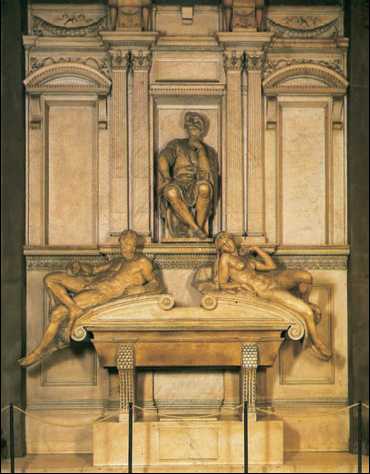 Работа над капеллой Медичи (1520-34), родовой усыпальницей властителей Флоренции, совпала с тяжелейшими испытаниями в жизни Микеланджело. В 1527 г. испанскими войсками был захвачен Рим. В 1530 г. пала Флоренция. Сражавшийся в рядах защитников города Микеланджело был вынужден скрываться, опасаясь мести Папы Климента VII, заключившего союз с испанским императором. Но Папа велел ему продолжить работу. Боль и крушение надежд, горькое разочарование отразились в полных трагизма скульптурах капеллы Медичи во флорентийской церкви Сан-Лоренцо. Проектируя капеллу, Микеланджело сумел создать один из самых гармоничных и выразительных интерьеров эпохи Возрождения. Гробницы двух безвременно умерших герцогов Микеланджело оформил в виде трёхфигурных скульптурных композиций. Наверху, в прямоугольных нишах, находились статуи покойных герцогов, а под ними – саркофаги с аллегорическими фигурами времён суток («Утро и Вечер», «День и Ночь»), которые должны были напоминать о неумолимом беге времени, приближающем человека к смерти. Мощные, подобные титаническим образам Сикстинской капеллы фигуры пребывают в мучительно-неудобных, неустойчивых позах, они лишены покоя, словно изнемогая от тягот жизни.
