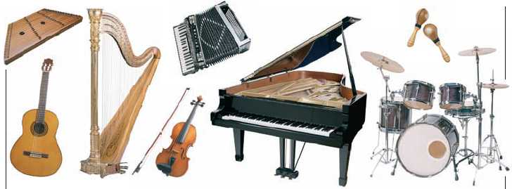 Музыкальные инструменты: цимбалы, гитара, арфа, скрипка, аккордеон, рояль, маракасы, ударная установка