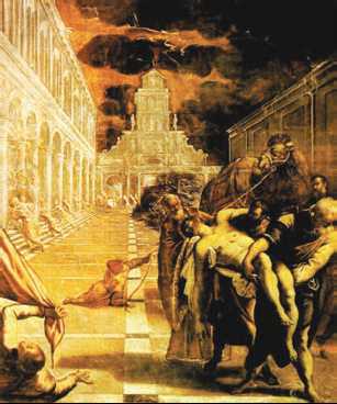 Смелая, свободная манера живописи Тинторетто казалась многим его современникам небрежной. Художник предпочитал динамичные диагональные композиции, сложные ракурсы, драматические световые эффекты («Рождение Иоанна Крестителя», кон. 1540-х гг.). Тинторетто прославила картина «Чудо св. Марка» (1548), в которой святой, спасая молившегося ему раба, стремительно «пикирует» с неба прямо в гущу толпы собравшихся на площади людей. Цикл, посвящённый жизни св. Марка, был продолжен картинами «Похищение тела св. Марка», «Спасение сарацина», «Опознание тела св. Марка» (все – 1562-66). Художник создаёт фантастические архитектурные построения с прорывами в глубину, которые словно выхвачены из тьмы мощными вспышками света. В «Похищении тела св. Марка» огненное небо озаряет призрачным светом площадь со смятенно мечущимися фигурами.