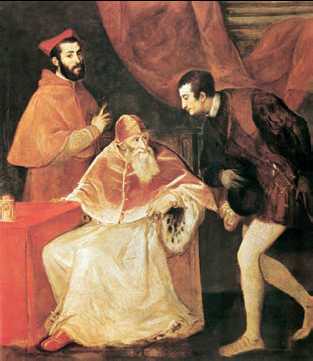 Тициан. «Папа Павел Ш с Алессандро и Оттавио Фарнезе». 1545-46 гг. Национальный музей и галерея Каподимонте. Неаполь