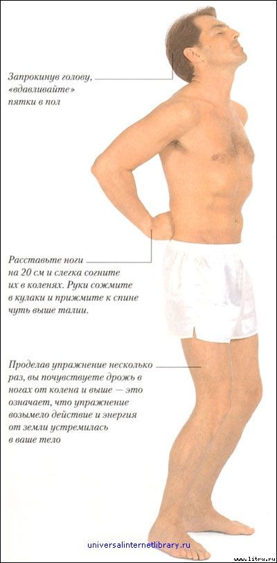 Встаньте, расставив ноги на 20 см и слегка согнув их в коленях. Руки сожмите в кулаки и прижмите их к спине чуть выше талии. На вдохе запрокиньте голову назад и одновременно попытайтесь как можно сильнее прижать пятки к полу. Оставайтесь в этом положении столько времени, сколько сможете, дышите спокойно и ритмично. Потом с силой выдохните и выпрямитесь. Стоя прямо, немного отдохните и переведите дыхание. Затем наклонитесь вперед так, чтобы пальцы рук почти коснулись пола. Ноги при этом должны оставаться прямыми, а пятки — плотно прижатыми к полу. Через пару минут выпрямитесь и расслабьтесь. Проделав упражнение несколько раз, вы почувствуете дрожь в ногах от колена и выше. Эта дрожь означает, что упражнение возымело действие — энергия от земли устремилась в ваше тело.
