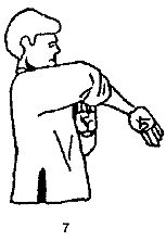 Это сбивающий блок. Движение производится в горизонтальной плоскости от центра тела к плечу, при этом ладонь в конечном положении не выходит за пределы корпуса. ПАК САУ используется для блокирования боковых и прямых ударов (рис. 4).