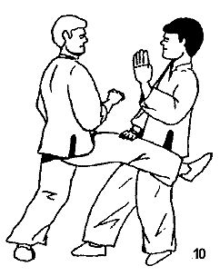 Старайтесь не отклонять корпус назад. Опорная нога должна быть немного согнута в колене, и, что самое важное, не отрывайте пятку от пола. Положение рук во время удара зависит от конкретной ситуации. На рис. 3 изображено использование прямого удара ногой с одновременным блоком БОН САУ.