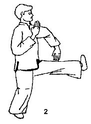 Затем, не останавливаясь, поднимите согнутую в колене левую ногу и моментально распрямите ее, нанося удар пяткой вперед (рис. 2).