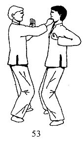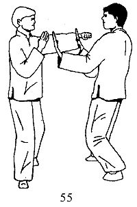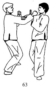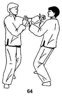 Вы, разворачиваясь влево, блокируете атаку, выполняя левой рукой движение У Сау, а правой, захватив руку партнера в области локтевого сустава, выполняете тянущее движение на себя и в сторону, что в реальном поединке должно привести к травме локтевого сустава (рис. 63).