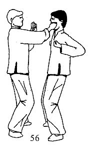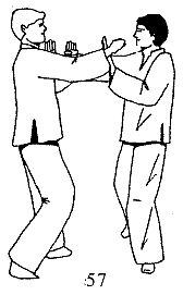 Вы блокируете атаку движением У САУ левой рукой, одновременно нанося правой удар ребром ладони в ключицу. Все действия сопровождаются разворотом тела влево (рис. 57).