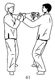 Вы, разворачиваясь телом влево, двумя руками захватываете руку партнера в области запястья и локтевого сустава, и выполняете как бы разрывающее движение руками в разные стороны. Такое действие в реальном поединке должно приводить к травме руки в локтевом суставе (рис. 60).