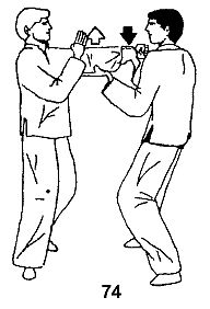 Далее партнер атакует левой рукой. Вы разворачиваетесь вправо, выполняете вышеописанные действия, сменив руки (рис. 74).