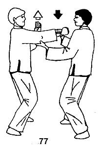 Партнер атакует прямым ударом в голову. Вы, развернувшись вправо, захватываете руку партнера своей правой рукой и тяните ее вниз, а левой наносите удар основанием ладони снизу вверх в область локтевого сустава (рис. 77).