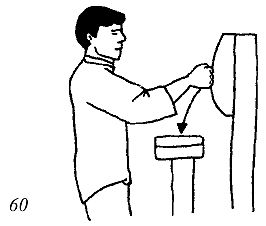 Расположитесь на расстоянии одного метра от настенного мешка. Подставка с другим мешком должна находиться в 20–30 см. от стенки. Нанесите ребром ладони правой руки удар по мешку на подставке (рис. 58, 59)
