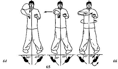 Далее по дугообразной траектории нанесите диагональный удар локтем (рис. 64, 65).