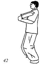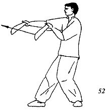 Измените стойку на правостороннюю, делая шаг правой ногой вперед. Левый клинок отводится назад, правым клинком нанесите удар Чап Дао. Острие клинка направлено влево (рис. 52).