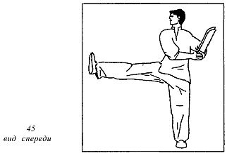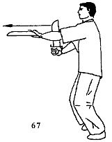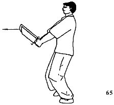 Подтяните левую ногу к правой, примите фронтальную стойку Вин Чун. Центральная линия вашего тела направлена вдоль линии «3», изображенной на рисунке 203. Клинки удерживаются перед собой в выпрямленных руках (рис. 65).