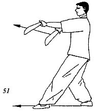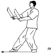 Левой ногой сделайте шаг вперед и примите левостороннюю переднюю стойку. Правый клинок принимает горизонтальное положение, острие направлено влево. Левым клинком нанесите рубящий удар Чап Дао (рис. 51).