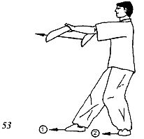Не меняя стойку, нанесите левым клинком прямой рубящий удар Чап Дао. Правый клинок отводится назад в горизонтальное положение (рис. 53).