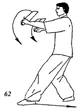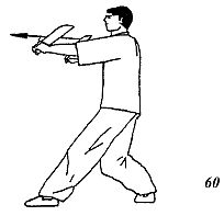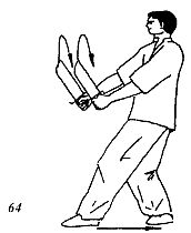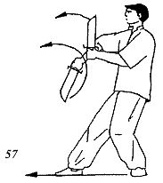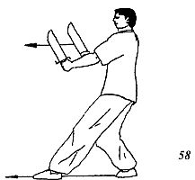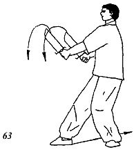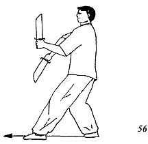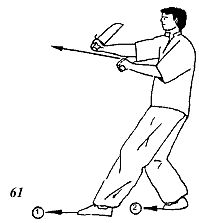 шаг вперед левой ногой, примите левостороннюю стойку. Левым клинком нанесите рубящий удар Чап Дао в верхний уровень. Острие клинка направлено вправо. Правый клинок отводится назад в горизонтальное положение (рис. 60).Не меняя стойку, правым клинком нанесите рубящий удар Чап Дао в верхний уровень. Острие клинка направлено вправо (рис. 61).