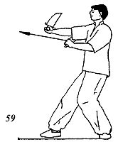 Делая шаг правой ногой вперед, поменяйте стойку на правостороннюю. Одновременно с перемещением, правым клинком нанесите рубящий удар Чап Дао в верхний уровень (рис. 59).