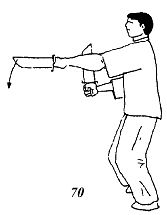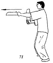 Нанесите левым клинком протыкающий удар Бил Дао в средний уровень. Правый клинок отводится назад в позицию У Дао (рис. 70).