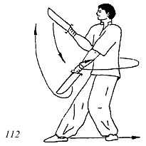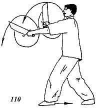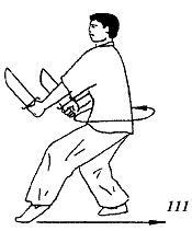 Шагните левой ногой вперед, принимая левостороннюю стойку. Левым клинком выполните рубящий удар Чап Дао изнутри наружу в средний уровень. Правый клинок отводится назад в позицию У Дао (рис. 110).