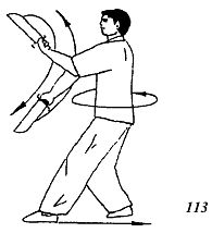 Сделайте левой ногой шаг назад. Принимая правостороннюю стойку, разверните корпус немного влево и выполните двойной блок Джан-Ган Дао (рис. 112).