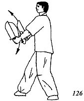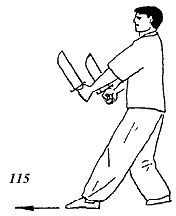 Повторите перемещение влево-вперед и затем вправо-вперед с блокирующими движениями Джан Дао обоими клинками (рис. 125, 126).