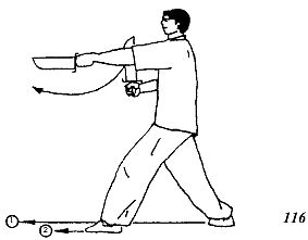 Сделайте левой ногой шаг вперед и нанесите левым клинком протыкающий удар Бил Дао в средний уровень (рис. 116).