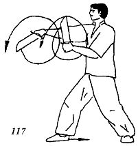 Поменяйте стойку на противоположную. Правым клинком нанесите рубящий удар Чап Дао изнутри наружу в средний уровень. Левый клинок отводится назад в позицию У Дао (рис. 117).