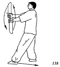 Сделайте шаг назад правой ногой и примите левостороннюю стойку. Корпус поверните немного вправо. Клинки изменяют свое положение на противоположное, т. е. левый направлен острием вниз, а правый — острием вверх (рис. 138).