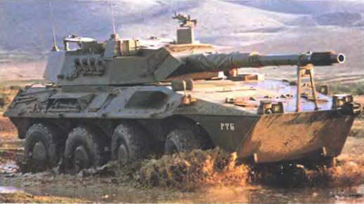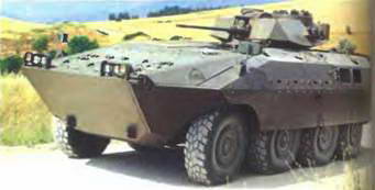 Тяжелая многоцелевая боевая машина «Чентауро В-1» (8x8) полной массой 24-25 т для разведки и ведения боевых действий, оснащена мотором ИВЕКО TCAV6 (12,9 л, 520л.с! расположенным в правой передней части корпуса, бортовой Н-образной трансмиссией, дву-1 мя передними и одной задней управляемыми осями, 3-местной башней со 105-мм пушкой] и двумя 7,62-мм пулеметами. До 1996 г. было изготовлено 400 машин первой серии, иче рез два года началось изготовление второго поколения «Чентауро-П». Входящие в него бронемашины отличаются удлиненным корпусом с дополнительной защитой бортов, в задней части которого размещен отсек для десантников и боекомплекта. Вариант «Чентауро VBO предлагается с пушками калибра 25 или 60 мм и отделением на 6~8 солдат с климатической установкой В исполнении «ис] требитель танков» бронеавтомобиль с экипажем из 4 человек оборудуют 105- или 120-мм пушками. На шасси «Чентауро» построены также 155-мм самоходная установка, штабная и санитарная машины. Скорость всех вариантов превышает 100 км/ч, запас хода-700-800 км.
