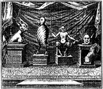 АВИЗОЯ— убивает детей, поражает глухотой, слепит глаза, смыкает уста уздою, губит рассудок и знобит тело. Цвет лица бледно-зеленоватый, волосы жёсткие, как у дракона, и все члены её невидимы. Видна лишь голова без туловища. Её изображения нередки на змеевиках.