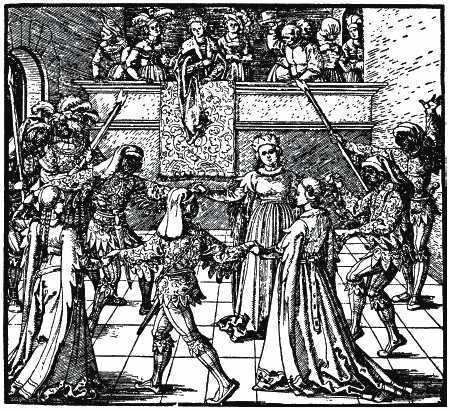 Здесь была доля истины, потому что с ростом благосостояния среднего класса и повышением требований к условиям жизни у бедняков хвастливые прогулки в лучшем платье перестали быть привилегией одного сословия. Для сохранения явных социальных отличий предпринимались попытки оживить законы, регулирующие расходы. В них было скрупулезно расписано, что могут и чего не могут носить различные классы общества. Елизавета Английская запрещала простолюдинам надевать брыжи и кринолины. Во Франции иметь одежду из золотой и серебряной парчи дозволялось только лицам королевской крови. Во Флоренции простым женщинам не разрешалось носить меха и пуговицы определенной формы, сделанные из ряда материалов. Законы эти сразу по принятии подвергались всеобщему поношению и не исполнялись. Их принимали вновь, придумывая иные виды запретов и наказаний, но на них снова не обращали внимания. Сдерживающим фактором оставался лишь объем кошелька. Развлечения придворных отражали настроения и вкусы государей. Неспешные интеллектуальные беседы, по воспоминаниям Кастильоне доставлявшие радость урбинскому двору, отнюдь не везде были любимым времяпрепровождением. Немцы находили удовольствие в шумных попойках; пьянство было национальным искусством. Еще им нравились бурные танцы, вызывавшие досаду и укоры трезвенников. Впрочем, такой знаток хороших манер, как Монтень, был приятно удивлен сердечной, но благовоспитанной манерой танцев, которую наблюдал в Аугсбурге. «Джентльмен целует руку дамы и кладет руку ей на плечо и притягивает ее к себе так близко, что они оказываются щека к щеке. Дама кладет руку ему на плечо, и таким манером они кружатся по комнате. У мужчин свои места, отдельные от дам, и вместе они не смешиваются». По всей вероятности, именно участие дам в придворных празднествах смягчило нравы (см. рис. 22).