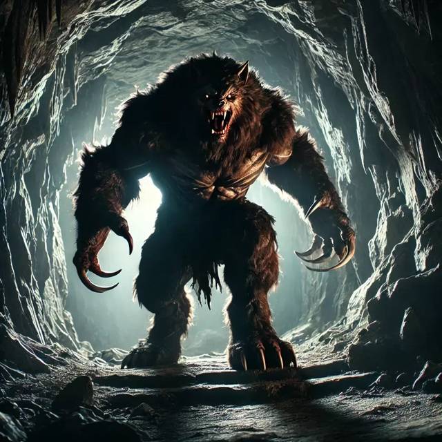 Из тени пещеры вышло существо, покрытое тёмной шерстью, его мощное тело перекрывало весь проход. Это был огромный чёрный зверь, нечто среднее между волком и медведем, с огромными клыками и когтями.