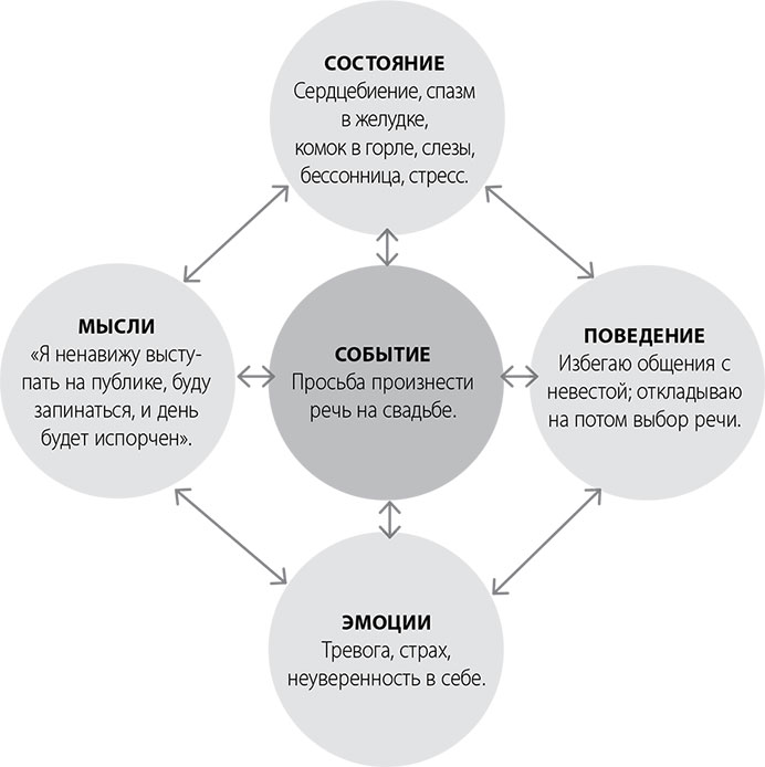 Например, вы могли очень сильно реагировать физически и отталкиваться от этого. То есть вы вспомнили, насколько были напряжены и что у вас возникло неприятное ощущение в желудке, словно вы на американских горках. После этого вы вспоминаете, что эти симптомы были вызваны мыслью «Я расстрою всю свадьбу» и т. д.