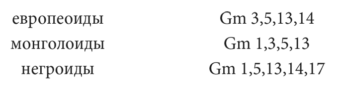 с момента разделения соответствующих ветвей древа. Более важной проблемой, однако, представляется попытка оценки продолжительности пребывания той или иной группы населения на данной территории, а также непосредственного определения динамики формирования этнорасовых общностей. В этой связи исследование характеристик мирового распределения факторов системы иммуноглобулинов (Gm) позволит подойти к решению поставленных выше вопросов.Уникальность генетической системы Gm заключается в том, что каждая из крупнейших рас обладает характерным, свойственным лишь ей генным комплексом Gm, причем такие маркирующие гаплотипы представлены максимальными значениями частот».