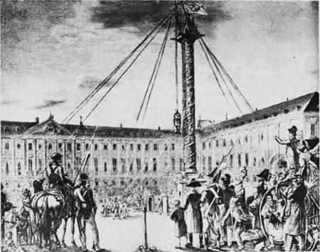 Снятие статуи Наполеона с колонны на Вандомской площади в Париже в 1814 году. С гравюры Опица.