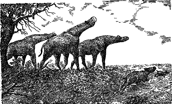 Рис. 17. Гигантские индрикотерии — крупнейшие млекопитающие, достигавшие 5 м в загривке, и два убегающих аллоцеропса (предки современных носорогов)