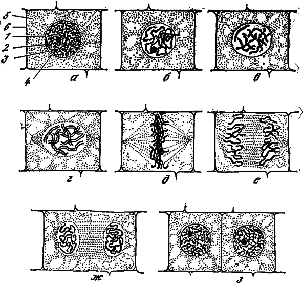 а — покоящаяся клетка: 1 — ядро, 2 — ядрышко, 3 — ядерная оболочка, 4 — хроматин в виде тонкой сети, 5 — цитоплазма, 6 — оболочка клетки; б — хроматин собирается в длинную нить; в — хроматиновая нить распадается на отдельные хромосомы, ядрышко исчезает; г — каждая хромосома продольно расщепляется на две; д — расщепившиеся хромосомы располагаются по экватору клетки (ядерная оболочка исчезает, происходит образование веретена деления с двумя полюсами); е — половинки хромосом расходятся к разным полюсам; ж — происходит образование дочерних ядер; з — две новые клетки такого же строения, как а