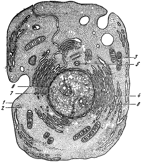 Схема строения клетки, основанная на электронно-микроскопических исследованиях1 — оболочка клетки, 2 — цитоплазма, 3 —митохондрии, 4 — эндоплазматическая сеть, 5 — центросома, 6 — оболочка ядра, 7 — ядро, 8 — ядрышко