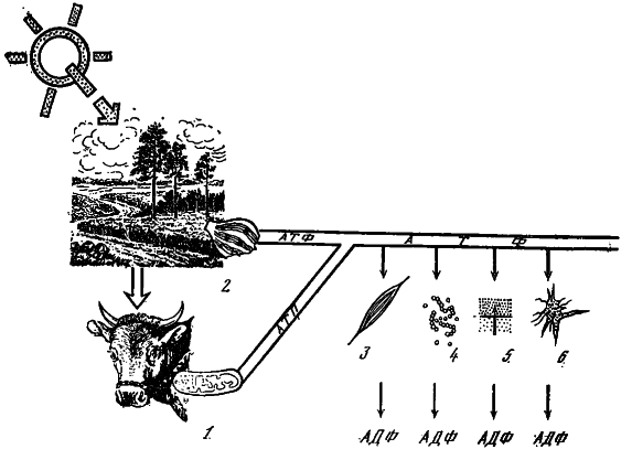 АТФ образуется в митохондриях (1) и в хлоропластах (2), обеспечивает энергией мышечное сокращение (3), синтез белка (4), движение веществ против градиента осмотического давления (5), передачу нервных импульсов (6). Образующийся при этом «разряженный» аденозиндифосфат (АДФ) вновь «заряжается» за счет солнечной энергии или энергии, заключенной в пище