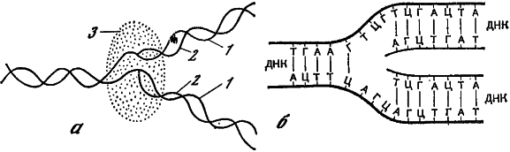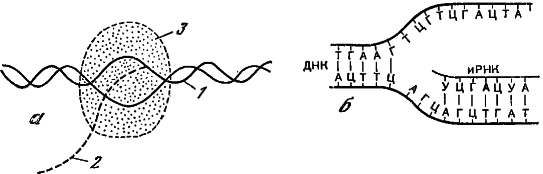 а — синтез информационной РНК (2) на основе нити ДНК (1) при помощи фермента РНК-полимеразы (3); б — образование нити иРНК путем присоединения дополнительных к паре нуклеотидов (транскрипция)