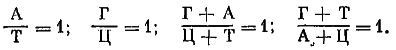 Как уже говорилось, у всех изученных организмов ДНК построена преимущественно из чередования четырех нуклеотидов, содержащих азотистые основания: аденин (А), гуанин (Г), тимин (Т) и цитозин (Ц). Поскольку аденин в двойной спирали ДНК всегда спаривается с тимином, а гуанин с цитозином, соблюдаются следующие правила, получившие по имени открывшего их ученого названия правил Чаргаффа: