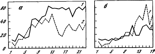 Мутация безглазия у дрозофилы проявляется не только как нарушение в развитии глаз, она обнаруживается также в пониженной плодовитости самок. Самки с наибольшим отклонением в строении глаз оказались наименее плодовитыми. В наследственно гетерогенных (неоднородных) культурах с мутацией безглазия нами был проведен отбор на плодовитость самок (1948). В двух линиях из трех повышение плодовитости сопровождалось ослаблением безглазия. В одной линии, однако, существенное повышение плодовитости привело к повышению проявления безглазия (рис. 40).