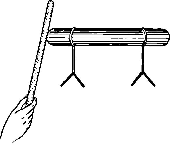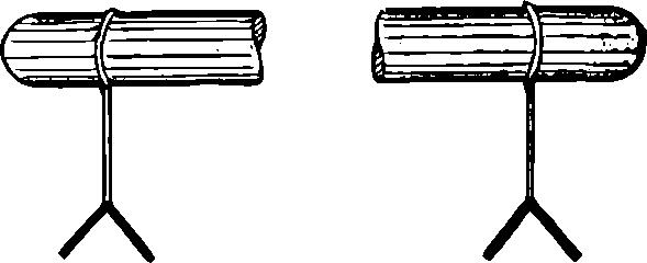 До осуществления эксперимента обратим внимание на то, висят ли листочки сомкнутыми вместе, ибо это их нормальное положение, или нет. Если они случайно не сомкнуты, то прикосновение пальца к металлическому стержню сведёт их вместе. После того как эти предварительные действия проделаны, эбонитовая палочка энергично натирается шерстяной тканью и приводится в соприкосновение с металлом. Листочки сразу же отойдут друг от друга. Они остаются в таком положении даже после того, как эбонитовая палочка будет отодвинута в сторону (рис. 27).
