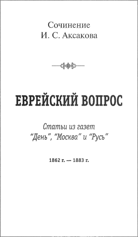 Мировой известности был человек. Поэт, ученый, правовед. И истовый патриот. В годы Крымской войны Иван Аксаков ушел в ополчение. А прославился он неистовой борьбой за свободу славян, за их объединение. За термином “панславизм” стоит и Иван Аксаков. Он организовал комитет в поддержку южных славян. Был одним из руководителей Славянского благотворительного фонда. Его речи потрясали – как, например, выступление на заседании Славянского комитета во время Берлинского конгресса (где, как известно, во имя равновесия сил в Европе почти на нет были сведены победы России над турками, отвоеванная было Болгария в значительной части осталась под протекторатом Османской империи). Популярность Аксакова была такова, что определенная часть болгарского общества желала видеть его своим царем. Однако Иван Аксаков был не просто патриотом, но и диссидентом. Открытые им журналы и газеты закрывались по цензурным соображениям – и в те годы правительство с трудом выносило честный и прямодушный патриотизм. Видимо, потому что патриоты делают явными многие тайные намерения (прежде времени?). Одновременно Иван Сергеевич был и либералом: выступал очень эмоционально против крепостного права, верил в то, что истина родится в честной полемике и т.д. Только имея это все в виду, можно адекватно понять его статьи, собранные в книге “Еврейский вопрос”.