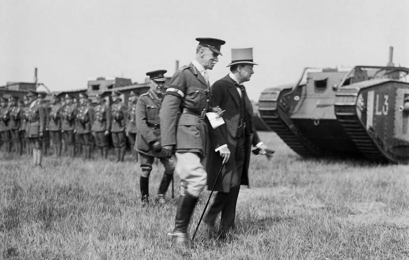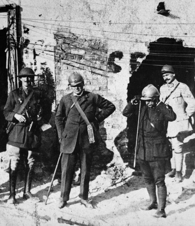 Черчилль с французскими военными в бельгийском Ньивпорте, неподалеку от места битвы при Ипре. 1916 г.