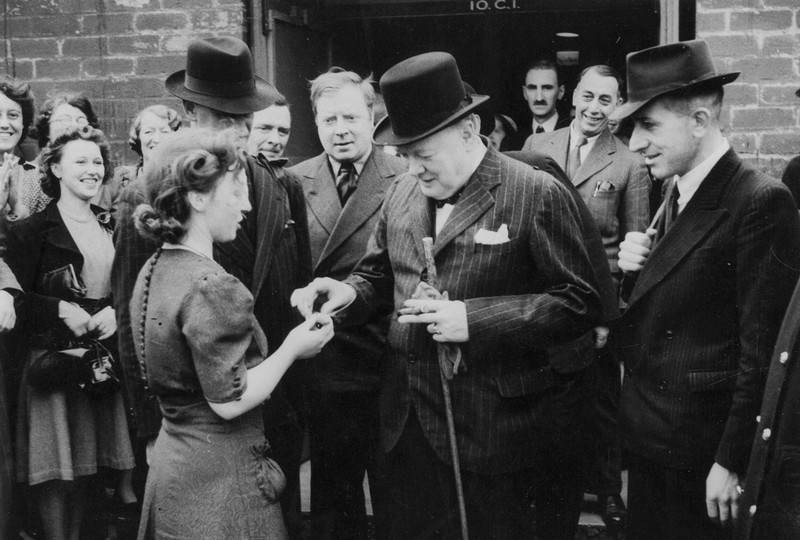 Черчилль принимает в дар сигару от работницы лондонской фабрики во время визита с целью поднятия боевого духа. Рядом с Черчиллем – австралийский министр иностранных дел д-р Эватт. 1942 г.