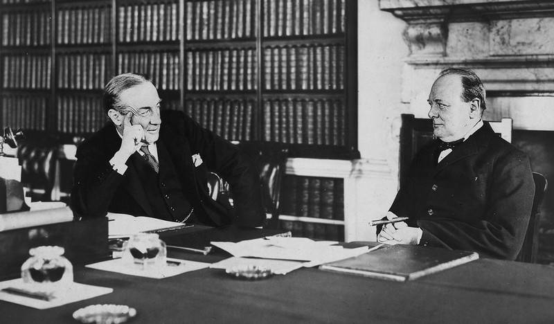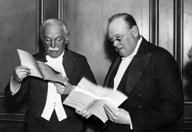 после аннексии Австрии Гитлером. 29 марта 1938 г.Премьер-министр Великобритании Стэнли Болдуин и Черчилль на Даунинг-стрит, 10. В этот день, 15 апреля 1929 г., Черчилль представил свой пятый, и последний, бюджет как канцлер казначейства