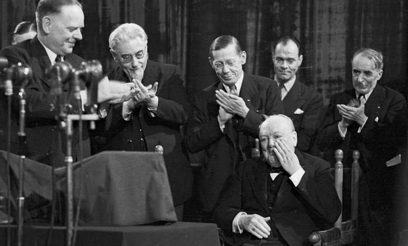 Черчилль растроган откликом на его речь на Конгрессе Европы в Гааге. Лидеры Европейского движения (слева направо): Керстенс, Рамадье, Ретингер и де Ружмон. 7 мая 1948 г.